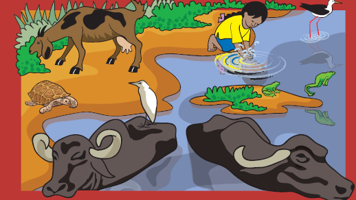 तालाब पर दिखे जानवरों का अभिनय ( एक्शन ) करके दिखाओ। कौन - सा जानवर क्या हरकत करता होगा ? जानवरों की अलग - अलग आवाजें भी निकालो। जानवरों के चलने का ढंग अलग - अलग होता है। कुछ चलते हैं तो कुछ रेंगते हैं। कुछ उड़ते हैं तो कुछ तैरते हैं। इसके लिए कुछ पैरों की मदद लेते हैं तो कुछ पंखों की। कुछ तो पूँछ का सहारा भी लेते हैं।