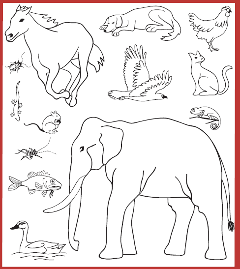 नीचे दिए चित्रों को देखो। इनमें से जो जानवर तुम्हारे घर में नहीं रहते , उनमें रंग भरो।