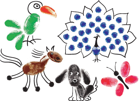 बच्चों को सृजनात्मक गतिविधियों जैसे उँगलियों और अंगूठे पर रंग लगाकर चित्र बनाना अच्छा लगता है। उन्हें अपनी इच्छा से अलग - अलग तरह के डिज़ाइन बनाने के लिए प्रोत्साहित करें।