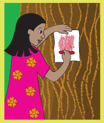 इसके लिए एक कागज़ को पकड़कर तने पर रखो और उस पर रंग फेरो। देखो , तुम्हारे कागज़ पर तने की छाप बन गई !