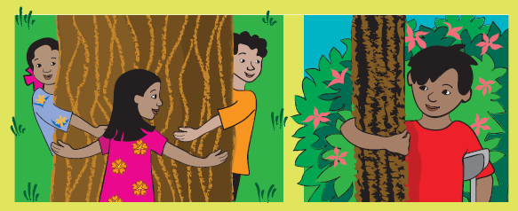 बच्चे फिर भागे मोटे और पतले तने वाले पेड़ों को छूने। क्या तुमने कोई ऐसा पेड़ देखा है जिसका तना चित्र में दिखाए गए पेड़ जितना मोटा हो ?