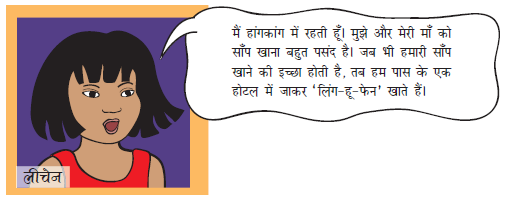 लीचेन — मैं हांगकांग में रहती हूँ। मुझे और मेरी माँ को साँप खाना बहुत पसंद है। जब भी हमारी साँप खाने की इच्छा होती है , तब हम पास के एक होटल में जाकर ' लिंग - हू - फेन ' खाते हैं।