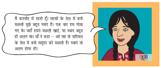 जूनी — मैं कश्मीर में रहती हूँ। सरसों के तेल में बनी मछली मुझे बहुत पसंद है। एक बार हम गोवा गए थे। वहाँ हमने मछली खाई , पर स्वाद बहुत ही अलग था। माँ ने कहा – अरे यह तो नारियल के तेल में बनी समुंदर की मछली है। स्वाद तो अलग होगा ही !