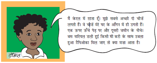 टॉमस — मैं केरल में रहता हूँ। मुझे सबसे अच्छी दो चीजें लगती हैं। वे चीजें मेरे घर के आँगन में ही उगती हैं। एक ऊपर ऊँचे पेड़ पर और दूसरी ज़मीन के नीचे। बस नारियल डली हुई किसी भी करी के साथ उबला हुआ टैपिओका मिल जाए तो क्या मज़ा आता है।