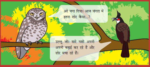 उल्लू जी। सारे पक्षी अपनी अपनी बड़ाई कर रहे हैं और शोर मचा रहे हैं।