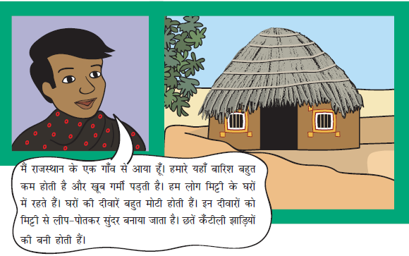 मैं राजस्थान के एक गाँव से आया हूँ। हमारे यहाँ बारिश बहुत । कम होती है और खूब गर्मी पड़ती है। हम लोग मिट्टी के घरों में रहते हैं। घरों की दीवारें बहुत मोटी होती हैं। इन दीवारों को मिट्टी से लीप - पोतकर सुंदर बनाया जाता है। छतें कँटीली झाड़ियों की बनी होती हैं।