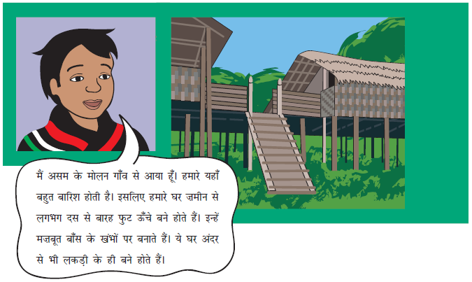 मैं असम के मोलन गाँव से आया हूँ। हमारे यहाँ बहुत बारिश होती है। इसलिए हमारे घर ज़मीन से लगभग दस से बारह फुट ऊँचे बने होते हैं। इन्हें मज़बूत बाँस के खंभों पर बनाते हैं। ये घर अंदर से भी लकड़ी के ही बने होते हैं।