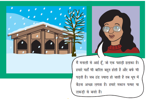 मैं मनाली से आई हूँ , जो एक पहाड़ी इलाका है। हमारे यहाँ भी बारिश बहुत होती है और बर्फ भी पड़ती है। जब ठंड ज़्यादा हो जाती है तब धूप में बैठना अच्छा लगता है। हमारे मकान पत्थर या लकड़ी से बनते हैं।