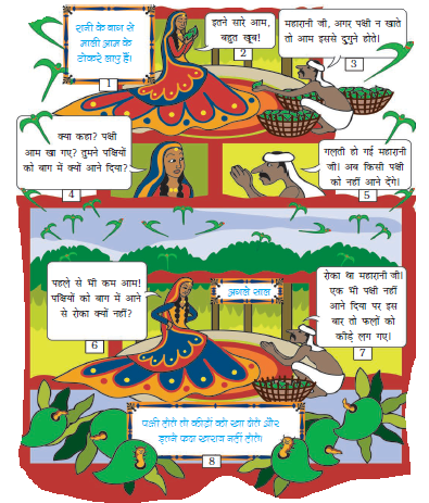7. रोका था महारानी जी। एक भी पक्षी नहीं आने दिया पर इस बार तो फलों को कीड़े लग गए। पक्षी होते तो कीड़ों को खा लेते और इतने फल खराब नहीं होते।