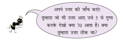 तुम्हारा जो भी उत्तर आए उसे 5 से गुणा करके देखो क्या 70 आता है। क्या तुम्हारा उत्तर ठीक था ?