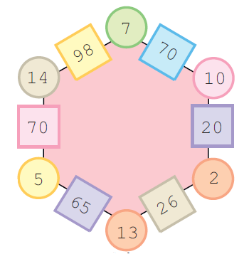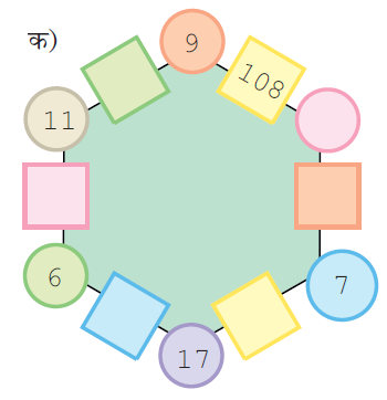 अंकों के पैटर्न को षट्कोण में देखो। हर भुजा पर 2 गोले और 1 चौकोर खाना है।