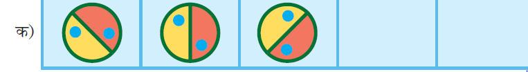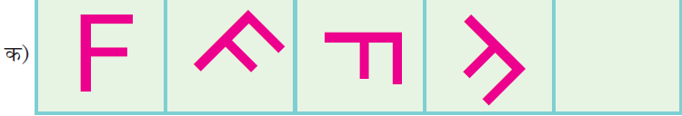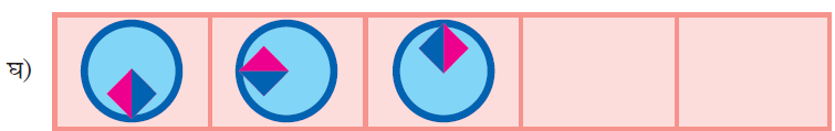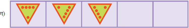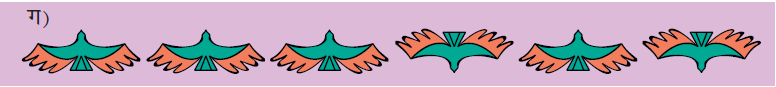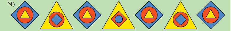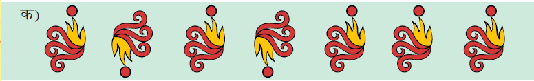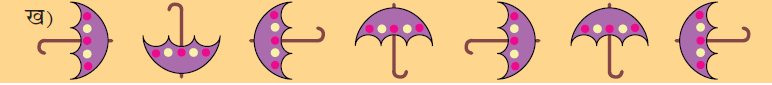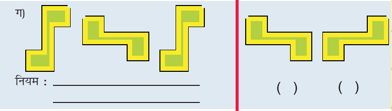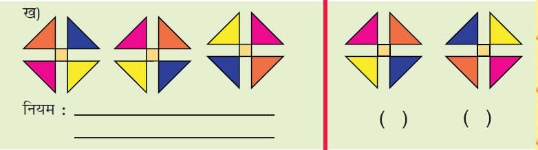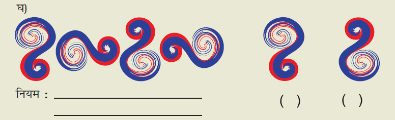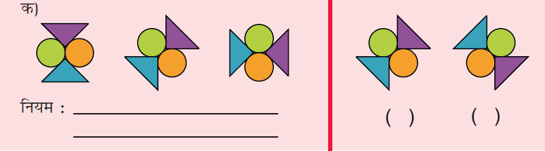 3) लाल रेखा के बाईं ओर नीचे कुछ पैटर्न दिए गए हैं। हर पैटर्न के लिए नियम लिखो। नियम का इस्तेमाल करते हुए आगे क्या आएगा उसे दाहिनी ओर से चुनो और निशान लगाओ।