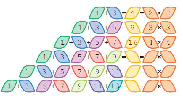 जब हम पहली n विषम संख्याओं को जोड़ते हैं तो हमें उनका जोड़ n x n मिलता है। बच्चों को संख्याओं को जोड़ने के लिए खुला छोड़ दें।