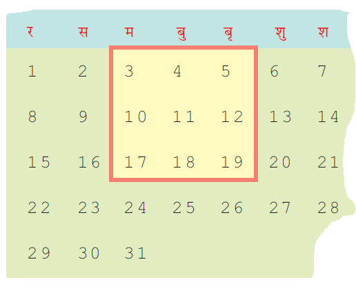 चलो,कैलेंडर पर 3 x 3 (9 तिथियों) का बक्सा बनाएँ और कुछ जादू देखें।
