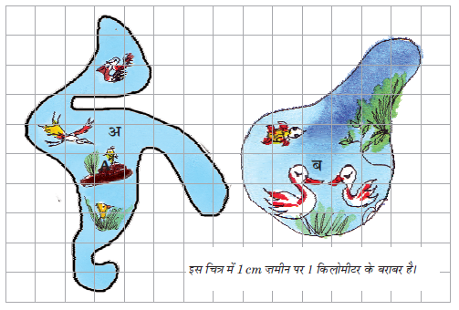 - पता करो कि चित्र में तालाब 'ब' का क्षेत्रफल (वर्ग cm में) कितना है। इसका असली क्षेत्रफल कितने वर्ग किलोमीटर है?