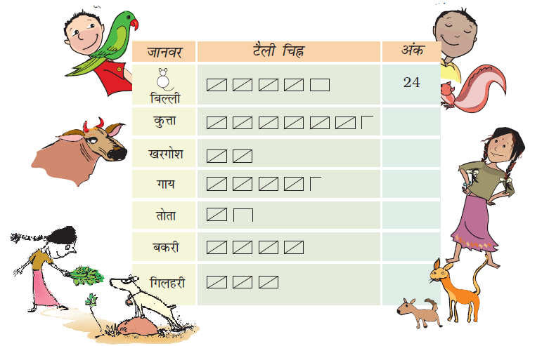 हरेक उत्तर को लिखने के लिए उसने टैली चिह्न लगाना शुरू कर दिया। अगर किसी ने कहा 'बिल्ली' तो उसने तालिका में 'बिल्ली' के सामने एक रेखा | खींची। फिर किसी ने दोबारा 'बिल्ली' कहा तो यामिनी ने एक रेखा और खींची। इसलिए का मतलब है दो बिल्लियाँ और Z का मतलब है 5 बिल्लियाँ। कुल 24 बच्चों ने 'बिल्ली' को अपना प्यारा पालतू जानवर बताया। यामिनी की तालिका पूरी करने में मदद करो।