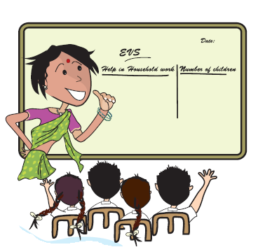 EVS के पीरियड में, अध्यापक ने बच्चों से पूछा कि क्या वे अपने माता-पिता की घर के कामों में मदद करते हैं? इसके अलग-अलग उत्तर मिले। बच्चों ने उन कामों को बताया जिनमें वे अपने माता-पिता की सबसे ज़्यादा मदद करते हैं। अध्यापिका ने सभी उत्तरों को इकट्ठा करके एक तालिका में लिख दिया।