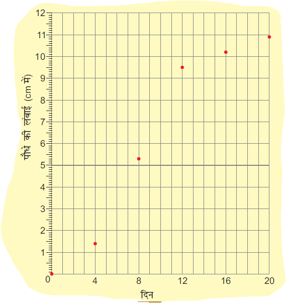 अमित ने मूंग की दाल के कुछ बीज ज़मीन में डाले। पहले चार दिनों में पौधे की लंबाई 1.4 cm हो गई। उसके बाद वह तेज़ी से बढ़ने लगा। हर चार दिन बाद अमित ने पौधे की लंबाई नापी और अगले पृष्ठ पर बने चार्ट में बिंदु लगाया। उदाहरण के लिए अगर हम चौथे दिन पर लगे बिंदु को देखें तो पता लगेगा कि पौधे की लंबाई 1.4 cm है। हर बिंदु की ऊँचाई को देखो और तालिका से जाँचो कि अमित ने बिंदु ठीक लगाए हैं कि नहीं।