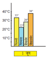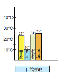 क्या तुमने टी.वी. या अखबार में मौसम की खबर देखी है? ये दो बार-चार्ट हैं। इनमें दो अलग-अलग दिनों में चार शहरों का अधिकतम तापमान दिखाया गया है। ये शहर हैं - दिल्ली, शिमला, बैंगलोर और जैसलमेर।
