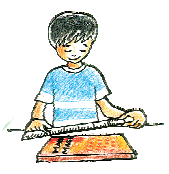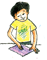 आनन और उसके मित्र कागज़ से घन बना रहे हैं। वह 19.5 cm का वर्ग कागज़ की शीट से काटते हैं। वह इसी तरह के 6 एक जैसे वर्गाकार कागज़ काटते हैं। इन चित्रों को देखते हुए अपना कागज़ का घन बनाओ।