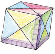 तुम्हारे कागज़ के घन की लंबाई से दुगुनी थी। तुम्हारे बने कितने कागज़ के घन इस बड़े घन के अंदर आएँगे ? अपनी कक्षा में बनाए गए सभी घनों को इकट्ठा करके बड़ा घन बनाने की कोशिश करो।