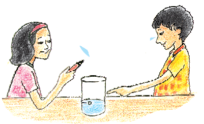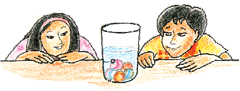 सारिका रंगीन कंचे, सिक्के, रबर आदि चीज़ों को इकट्ठा करती है। उसने एक गिलास में पानी लेकर, पानी के ऊपरी स्तर पर '0' का निशान लगाया।