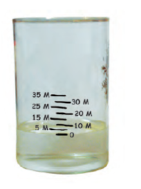 35 कंचों की मदद से अपना मापक गिलास खुद तैयार करो। एक गिलास लो और उस पर '0' का निशान लगाओ। फिर उसमें 5 कंचे डालकर 5 M का निशान लगाओ। उसमें फिर 5 कंचे और डालो और पानी के नए स्तर पर 10 M लिखो। इसी प्रकार 15 M, 20 M 25 M, 30 M और 35 M के निशान लगाओ।