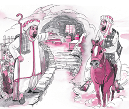 Disguised as a shepherd and riding on a mule, one day the king came to the cave where the wise shepherd lived. As soon as the shepherd saw the traveller coming towards the cave, he rose to welcome him. He took the tired traveller inside the cave, gave him water to drink and a share of his own meagre meal. The king rested for the night in the cave and was greatly impressed by the shepherd’s hospitality and wise conversation.