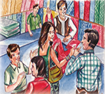 (चारों बाज़ार जाते हैं। कपड़े की दुकान पर पहुँचते हैं।)