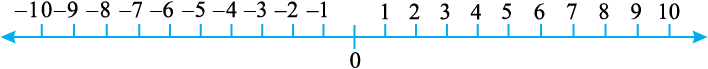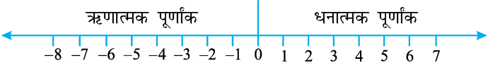 एक रेखा खींचिए और उस पर समान दूरी पर कुछ बिंदु अंकित कीजिए, जैसा कि ऊपर आकृति में दिखाया गया है। इनमें से एक बिंदु को शून्य से अंकित कीजिए। शून्य के दाईं ओर के बिंदु धनात्मक पूर्णांक हैं और इन्हें + 1, + 2, + 3 इत्यादि या केवल 1, 2, 3 इत्यादि से अंकित किया गया है। शून्य के बाईं ओर के बिंदु ऋणात्मक पूर्णांक हैं और इन्हें – 1, – 2, – 3 इत्यादि से अंकित किया गया है।