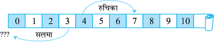 अब सलमा ने सुझाव दिया कि चूँकि वह शून्य से एक स्थान पीछे है, इसलिए इस स्थान को नीले एक से अंकित किया जा सकता है। यदि टोकन नीले एक पर है, तो नीले एक के पीछे वाला स्थान ‘नीला दो’ होगा। इसी प्रकार ‘नीले दो’ के पीछे वाला स्थान ‘नीला तीन’ होगा। इस प्रकार से वे पीछे चलने का निर्णय लेती हैं। परंतु उन्हें नीला कागज़ नहीं मिला। तब रुचिका ने कहा कि जब हम विपरीत दिशा में चल रहे हों, तो हमें दूसरी ओर एक चिह्न का प्रयोग कर लेना चाहिए। इस प्रकार, देखिए कि शून्य से छोटी संख्याओं पर जाने के लिए