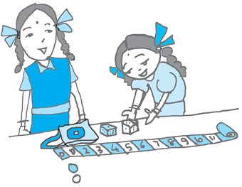 आइए, सलमा और रुचिका द्वारा पहले खेले गए खेल पर विचार करें। मान लीजिए कि रुचिका का टोकन 2 पर है। अगली बार, उसे लाल पासा प्राप्त होता है और उसे फेंकने पर संख्या 3 प्राप्त होती है। इसका अर्थ है कि वह 2 के दाईं ओर 3 स्थान चलेगी।