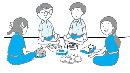 खाते समय उन्होंने यह चर्चा की कि वे भिन्नों के बारे में पहले क्या पढ़ चुके हैं। 4 बराबर भागों में से 3 भाग  दर्शाते हैं। इसी प्रकार, जब हम एक पूर्ण को 7 बराबर भागों में विभाजित (बाँट) कर उसमें से 3 भाग लें, तो