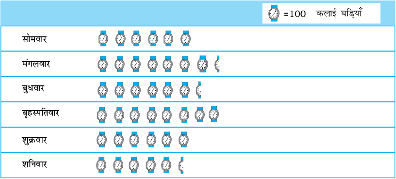 उदाहरण 6 : किसी सप्ताह में, एक फैक्टरी द्वारा निर्मित कलाई घड़ियों की संख्या निम्न चित्रालेख द्वारा प्रदर्शित है :