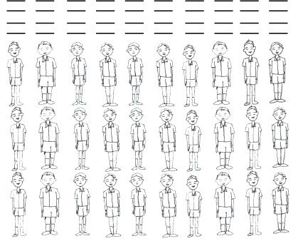 आइए एक और उदाहरण लें। किसी स्कूल में गणतंत्र दिवस मनाने के अवसर पर, बच्चे मुख्य अतिथि के सम्मुख सामूहिक ड्रिल (Drill) का प्रदर्शन करने जा रहे हैं। वे इस प्रकार खड़े किए जाते हैं कि एक पंक्ति में 10 बच्चे रहें (आकृति 11.4)। इस ड्रिल में कितने बच्चे भाग ले सकते हैं?