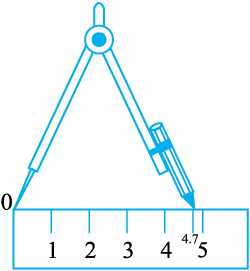 चरण 2 परकार के नुकीले सिरे को रूलर के शून्य पर रखिए। इसे इस प्रकार खोलिए कि पेंसिल वाला सिरा 4.7 सेमी चिह्न पर आ जाए।