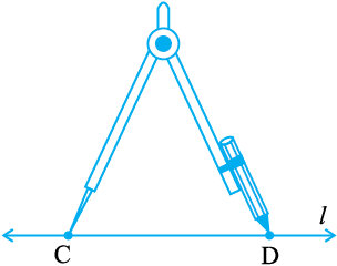 चरण 3 कोई रेखा l खींचिए। l पर कोई बिंदु C लीजिए। परकार के फैलाव में बिना कुछ परिवर्तन किए, उसके नुकीले सिरे को C पर रखिए।