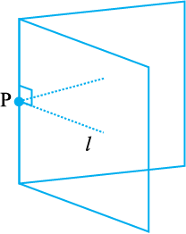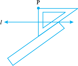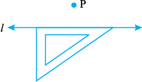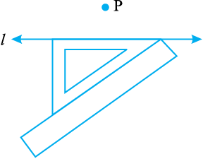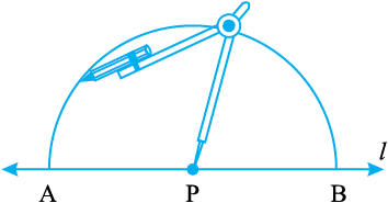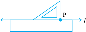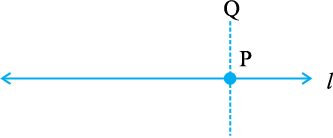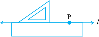 एक रेखा l कागज़ पर खिंची हुई है और P उस पर स्थित एक बिंदु है। P से होकर गुजरता हुआ l पर लंब खींचना सरल है।