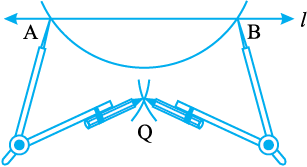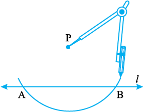 चरण 3 यह सावधानी लेते हुए कि परकार के फैलाव में कोई परिवर्तन न हो, उसके नुकीले सिरे को बिंदु A पर रखें और l को B पर काटता हुआ एक चाप लगा दीजिए।