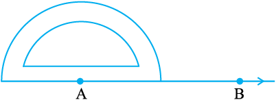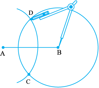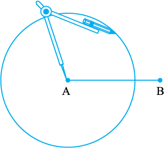 चरण 2	परकार के नुकीले सिरे को A पर रखिए और पेंसिल को B पर रखिए। परकार का फैलाव  की लंबाई बताता है।