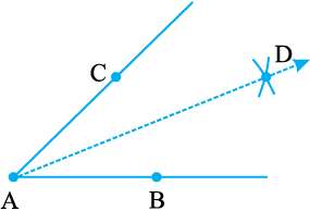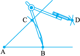 चरण 3	C को केंद्र मानकर एक चरण 2 वाली त्रिज्या लेकर, ∠A  के अभ्यंतर में एक और चाप लगाइए। मान लीजिए ये दोनों चाप बिंदु D पर प्रतिच्छेद करते हैं तब  ही  ∠A का वांछित समद्विभाजक है।