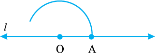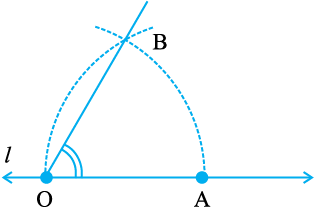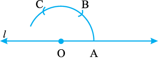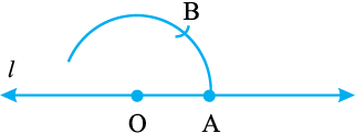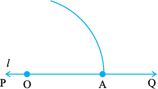 चरण 2 परकार के नुकीले सिरे को O पर रखिए और एक सुविधाजनक त्रिज्या लेकर एक चाप खींचिए, जो रेखा l को, मान लीजिए बिंदु A पर काटता है।