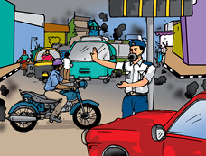 fचित्र 15.8 भीड़ भरे चौराहे पर एक पुलिसकर्मी द्वारा मुखौटा पहनकर यातायात नियंत्रण