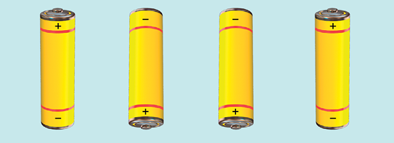 टॉर्च, ट्रॉज़िस्टर, रेडियो, खिलौने, टीवी रिमोट कंट्रोल जैसी कई युक्तियों में बैटरी उपयोग की जाती हैं। तथापि, इनमें से कुछ युक्तियों में विद्युत सेलों को सदैव ही चित्र 14.2 में दर्शाए अनुसार एक के बाद दूसरे को नहीं रखा जाता है। कभी-कभी सेलों को एक के साथ दूसरे से सटा कर रखा जाता है। तब फिर सेलों के टर्मिनलों को किस प्रकार संयोजित करते हैं? किसी भी युक्ति के बैटरी वाले खाने को ध्यान से देखिए। प्रायः इसमें एक मोटा तार अथवा धातु की पत्ती होती है, जो एक सेल के धन टर्मिनल को दूसरे सेल के ऋण टर्मिनल से जोड़ती है (चित्र 14.3)। बैटरी के खानों में सेलों को सही ढंग से रखने के उद्देश्य से आपकी सहायता के लिए प्रायः इन पर ‘+’ तथा ‘-’ चिह्न अंकित होते हैं।