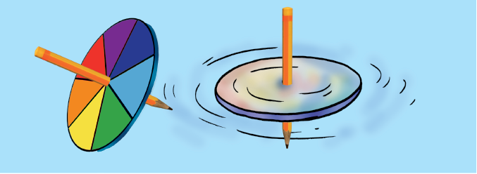 लगभग 10 cm व्यास की गत्ते की एक वृत्ताकार डिस्क लीजिए। इस डिस्क को सात खंडों में बाँट लीजिए। चित्र 15.31 (a) में दर्शाए अनुसार इन खंडों को इंद्रधनुष के सात वर्णों से पेंट कीजिए। आप इन खंडों पर विभिन्न वर्णों के कागज़ भी चिपका सकते हैं। डिस्क के केंद्र पर एक छोटा छिद्र बनाइए। डिस्क को एक बॉल पेन के रीफ़िल की नोक पर ढीले से लगाइए। सुनिश्चित कीजिए कि डिस्क स्वतंत्रतापूर्वक घूर्णन कर (घूम) सके [चित्र 15.31 (a)]। डिस्क को दिन के प्रकाश में घुमाइए। जब डिस्क तेज़ी से घूमती है, तो वर्ण आपस में मिल जाते हैं तथा डिस्क श्वेत सी प्रतीत होती है [चित्र 15.31 (b)]।