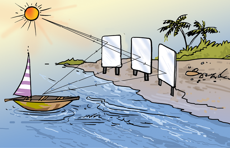 दर्पण, अस्त्रों की भाँति भी उपयोग में लाए जा सकते हैं। कहते हैं कि ग्रीक वैज्ञानिक आर्किमीडीज़ ने लगभग दो हजार वर्ष पहले एेसा कर दिखाया था। जब रोमनों ने ग्रीक के समुद्री तट के सायराक्यूज (सिसली) नामक नगर पर आक्रमण किया, तो आर्किमीडीज़ ने चित्र 15.34 में दर्शाए अनुसार दर्पणों को लगाया। दर्पणों को किसी भी दिशा में घुमाया जा सकता था। इन्हें इस प्रकार व्यवस्थित किया गया कि वे सूर्य के प्रकाश को रोमन सैनिकों के ऊपर परावर्तित कर सकते थे। सूर्य के प्रकाश से रोमन सैनिक चौंधिया गए। वे नहीं जानते थे कि क्या हो रहा है। वे चकरा गए और भाग खड़े हुए। यह एक एेसा उदाहरण है, जो यह स्पष्ट करता है कि किस प्रकार सैनिक ताकत पर सूझ-बूझ से विजय पाई जा सकती है।