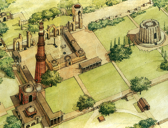 बारहवीं सदी के आखिरी दशक में बनी क़ुव्वत अल-इस्लाम मसजिद तथा उसकी मीनारें। यह जामा मसजिद दिल्ली के सुलतानों द्वारा बनाए गए सबसे पहले शहर में स्थित है। इतिहास में इस शहर को देहली-ए कुह्ना (पुराना शहर) कहा गया है। इस मसजिद का इल्तुतमिश और अलाउद्दीन ख़लजी ने और विस्तार किया। मीनार तीन सुलतानों-क़ुत्बउद्दीन एेबक, इल्तुतमिश और फ़िरोज़शाह तुग़लक़ द्वारा बनवाई गई थी।