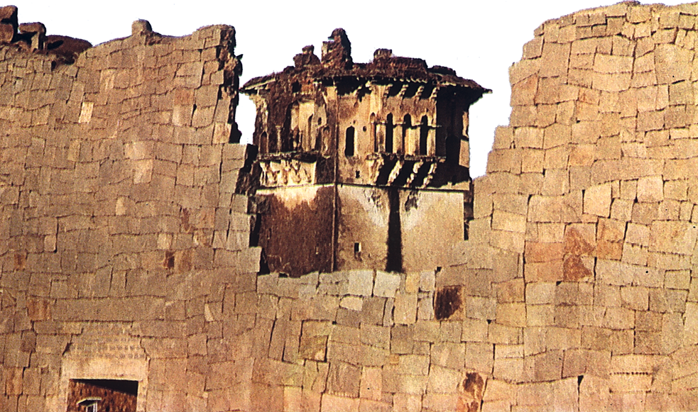 हम्पी के अहाते की टूटी हुई दीवार से बुर्ज का दृश्य