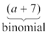 Examples of binomials: a + b, 4l + 5m, a + 4, 5 –3xy, z2 – 4y2, etc.