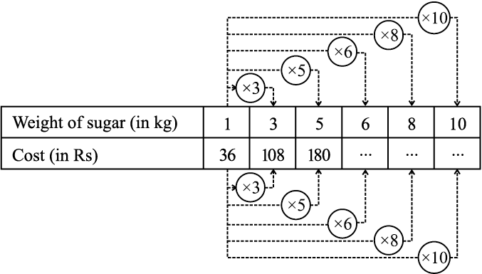 If the cost of 1 kg of sugar is ` 36, then what would be the cost of 3 kg sugar? It is ` 108. Similarly, we can find the cost of 5 kg or 8 kg of sugar. Study the following table.